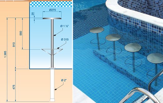 O banco para piscinas é constituído todo em aço inoxidável, tornando seu conjunto resistente à corrosão. Seu assento, juntamente com o tubo principal e o apoio dos pés são desmontáveis, propiciando assim amplo espaço no interior da piscina quando o banco não estiver sendo utilizado. Pode ser instalado tanto em piscinas de vinil ou alvenaria.